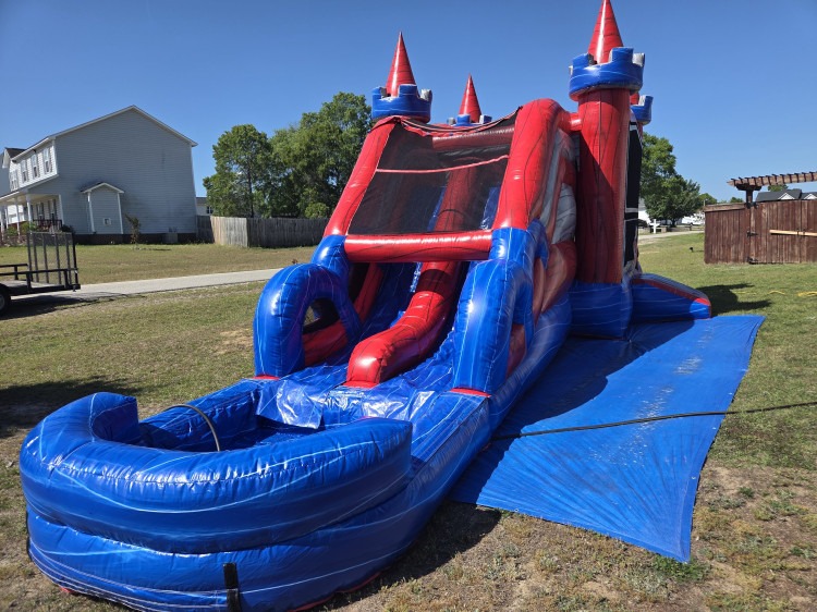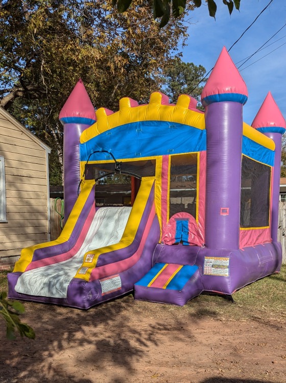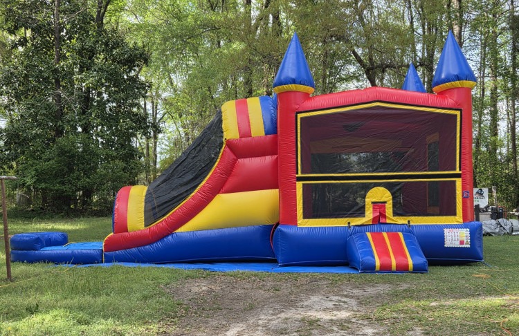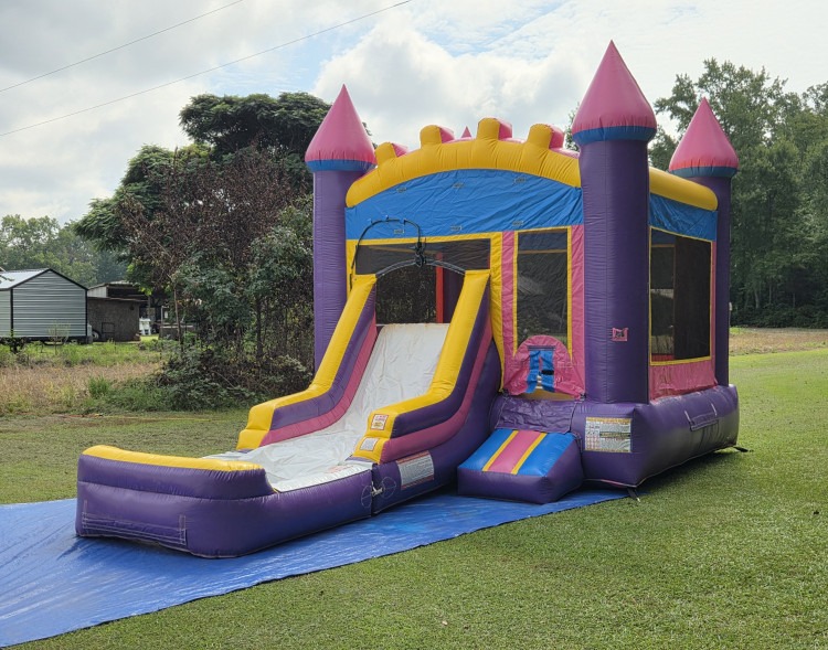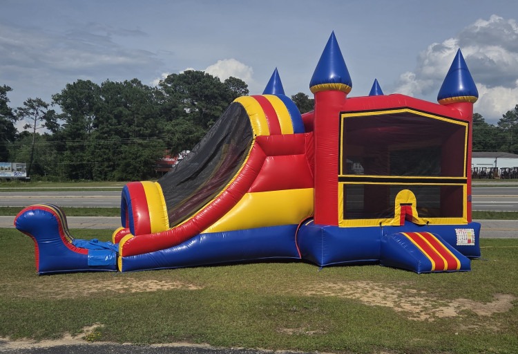 Get the best of both worlds with a castle AND a slide in one large inflatable! Our full-sized combo bouncers comes with a basketball hoop and slide that is built in with a bounce space! We specialize in bounce house rentals and would be delighted to help you with your party needs.